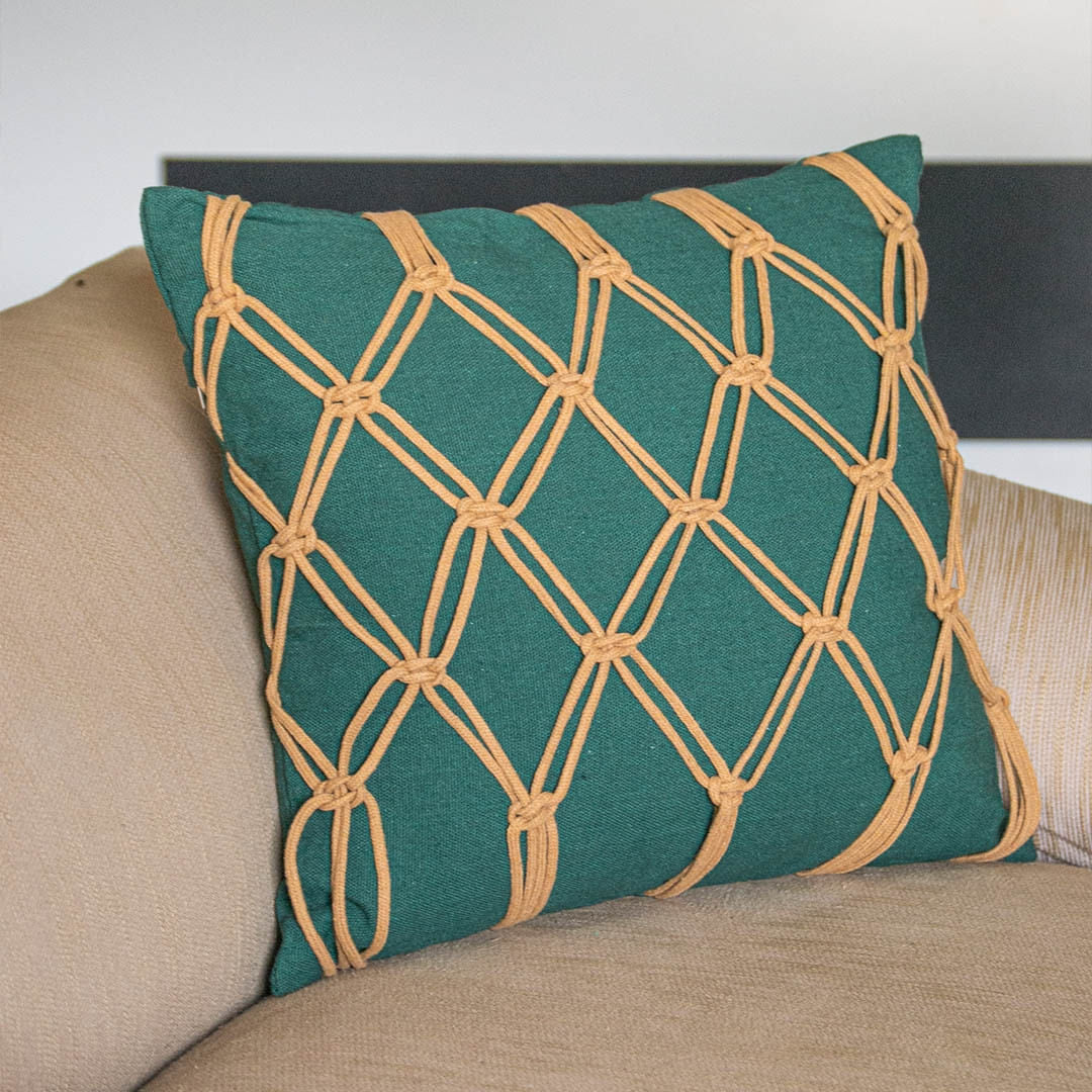 Transforme seu espaço com a Capa de Almofada Macramê, um toque de cor e textura que abraça seu ambiente. Feita com tecido plano reciclado verde musgo e detalhes artesanais em macramê caramelo, ela é pura alegria sustentável. O fechamento em zíper garante praticidade e um visual impecável. Ideal para quem busca um lar com personalidade e charme extra!