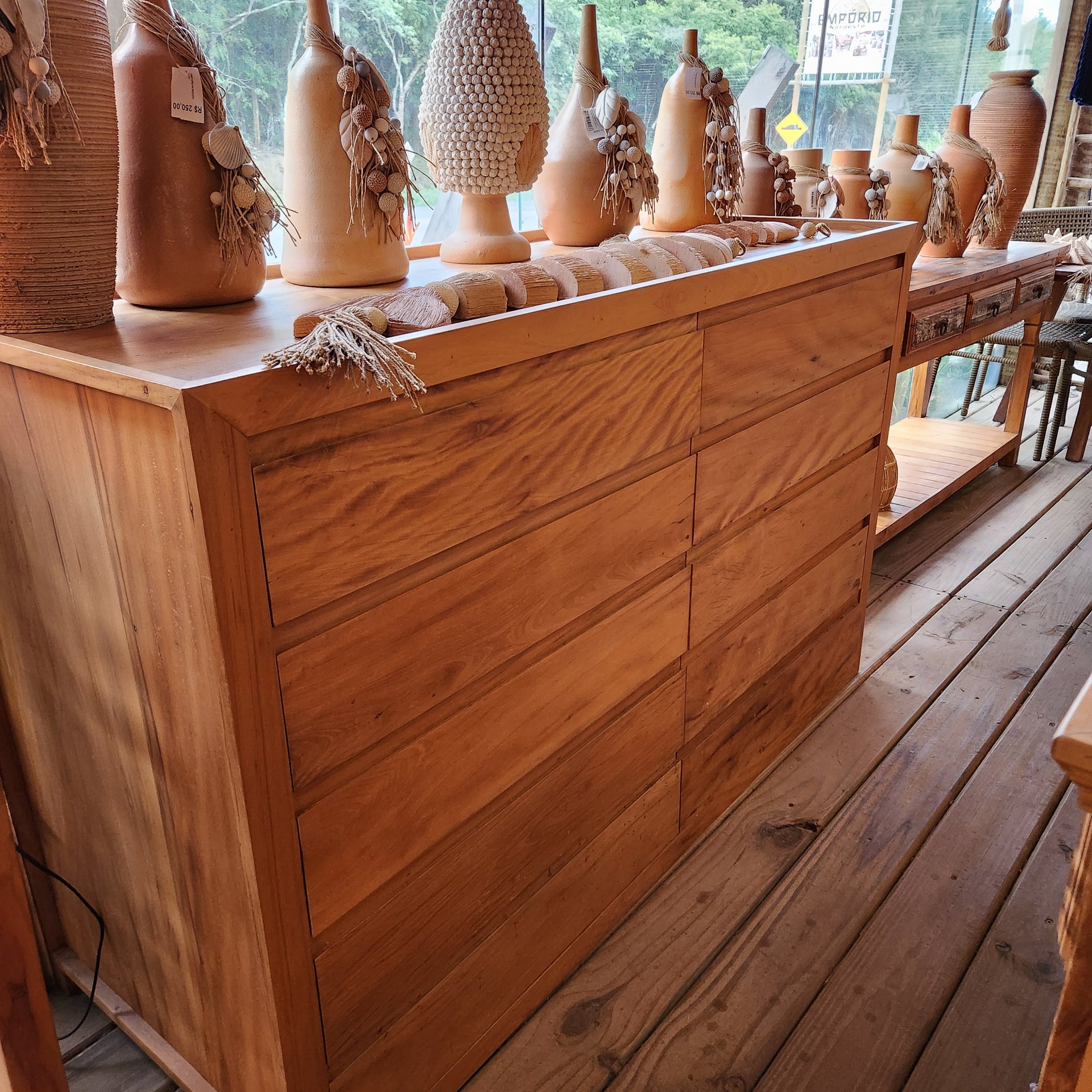 Esta cômoda de 10 gavetas é feita de madeira de peroba rosa, conhecida por sua durabilidade e beleza natural. Seu design elegante e imponente mede 1,60 x 60cm, com uma altura de 1 metro, criando um impacto visual em qualquer ambiente. Organize suas roupas com facilidade e estilo com esta peça de mobiliário de alta qualidade.