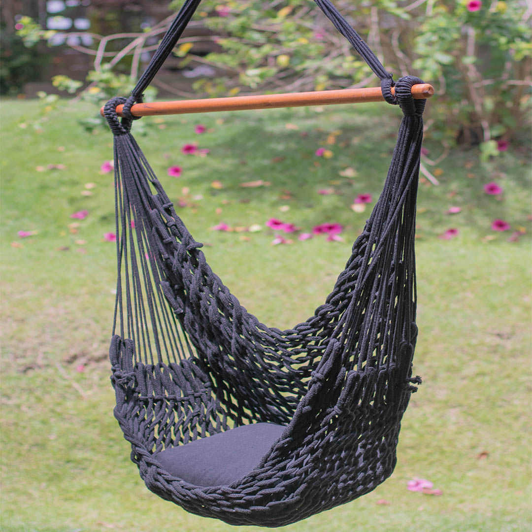 A cadeira de rede é um móvel que tem invadido todos os ambientes! Feita com cordas entrelaçadas e tecido ecológico, é perfeita para relaxar em qualquer lugar. Com composição de 80% algodão e 20% poliéster, é uma opção confortável e sustentável. A dimensão do tecido é de 1,40 m x 0,55 cm, e a madeira tem 1,25 m de altura. A capacidade é de 120kg, e vem com uma bolsa plástica para armazenamento.