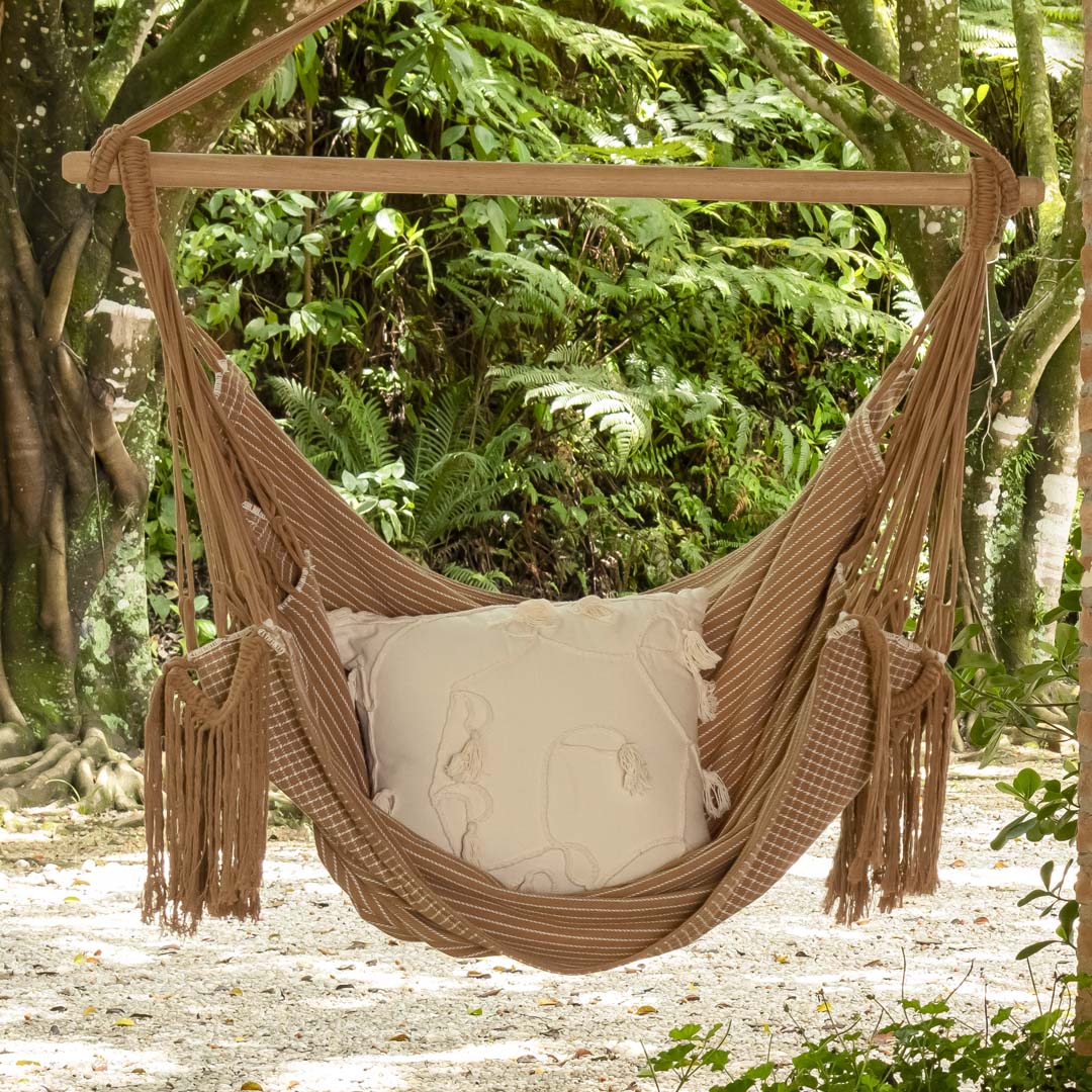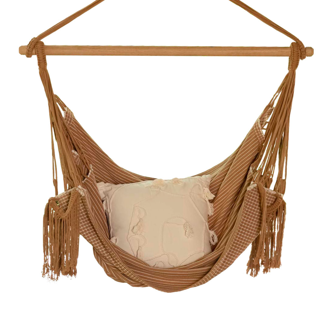 A Rede Cadeira Giz foi projetada para quem busca o máximo de conforto e sofisticação. Com seu estofado super macio, ela proporciona o suporte ideal para garantir um descanso relaxante sem causar dores nas costas. A franja longa e ornamental adiciona um toque de elegância, transformando qualquer ambiente em um espaço de bem-estar e estilo. É ideal para varandas, jardins ou até dentro de casa, combinando conforto incomparável com um design artesanal exclusivo. Composição: 100% algodão, as dimensões são de 1,50 m x 1,30 m e tem capacidade para 120 kg.