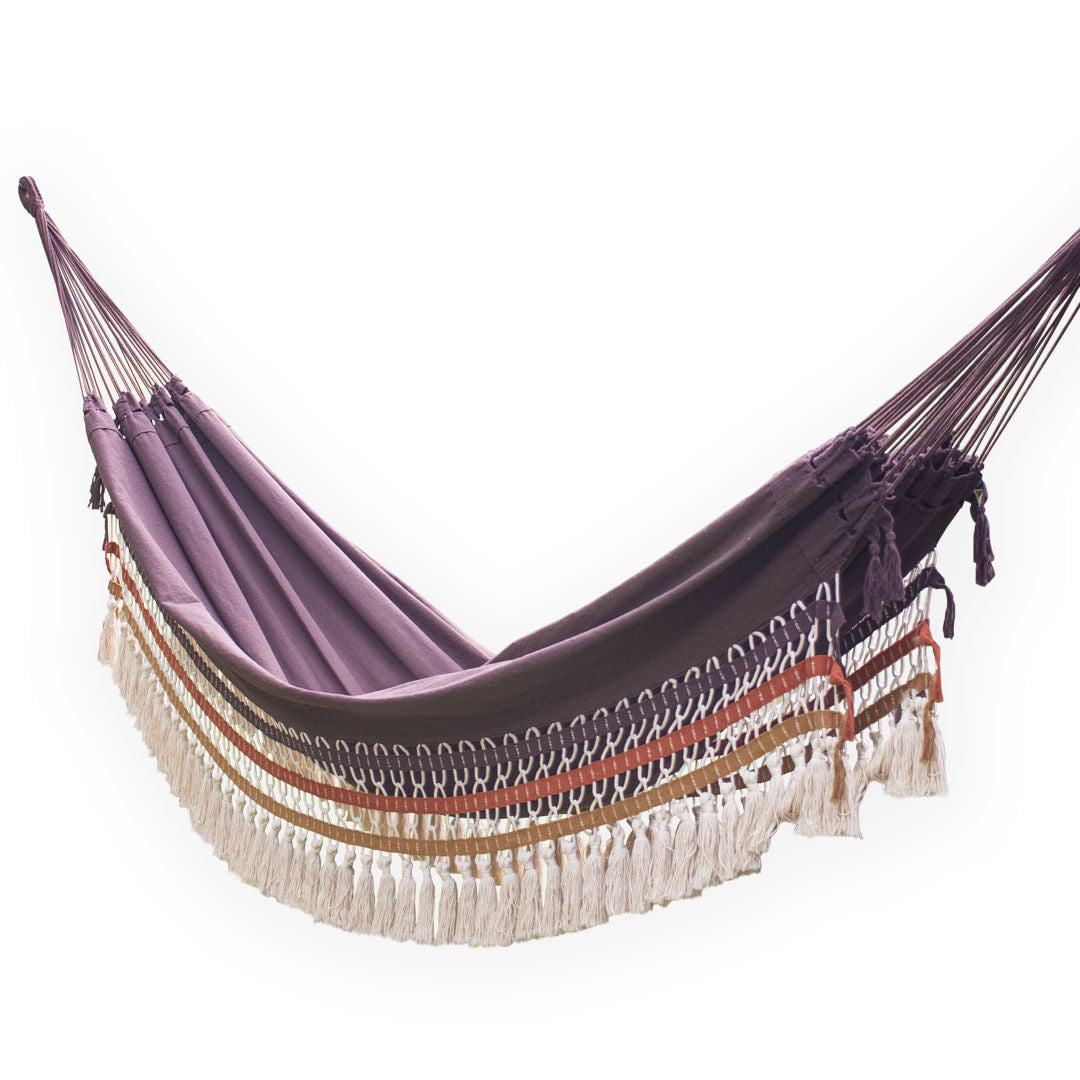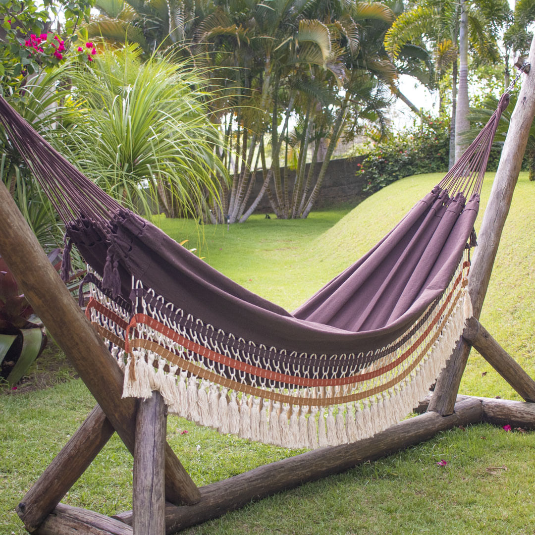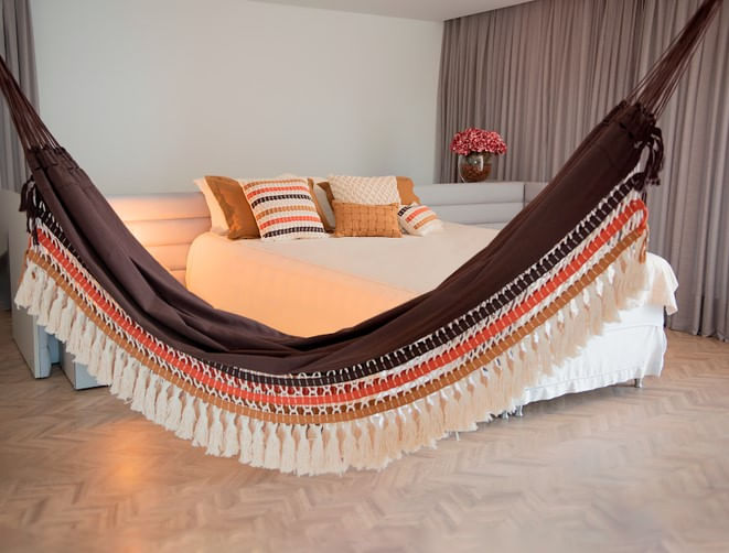 Uma rede de descanso casal com tecido plano de cor marrom, recria novas funções para os cabos e mamucabas que unem o corpo da rede ao punho. Com uma diferencial tipologia artesanal macramê, os punhos, caréus e mamucabas também são feitos à mão. A rede tem uma capacidade de 180kg e é feita de 80% algodão e 20% poliéster. É perfeita para quem procura uma rede de descanso confortável e estilosa.