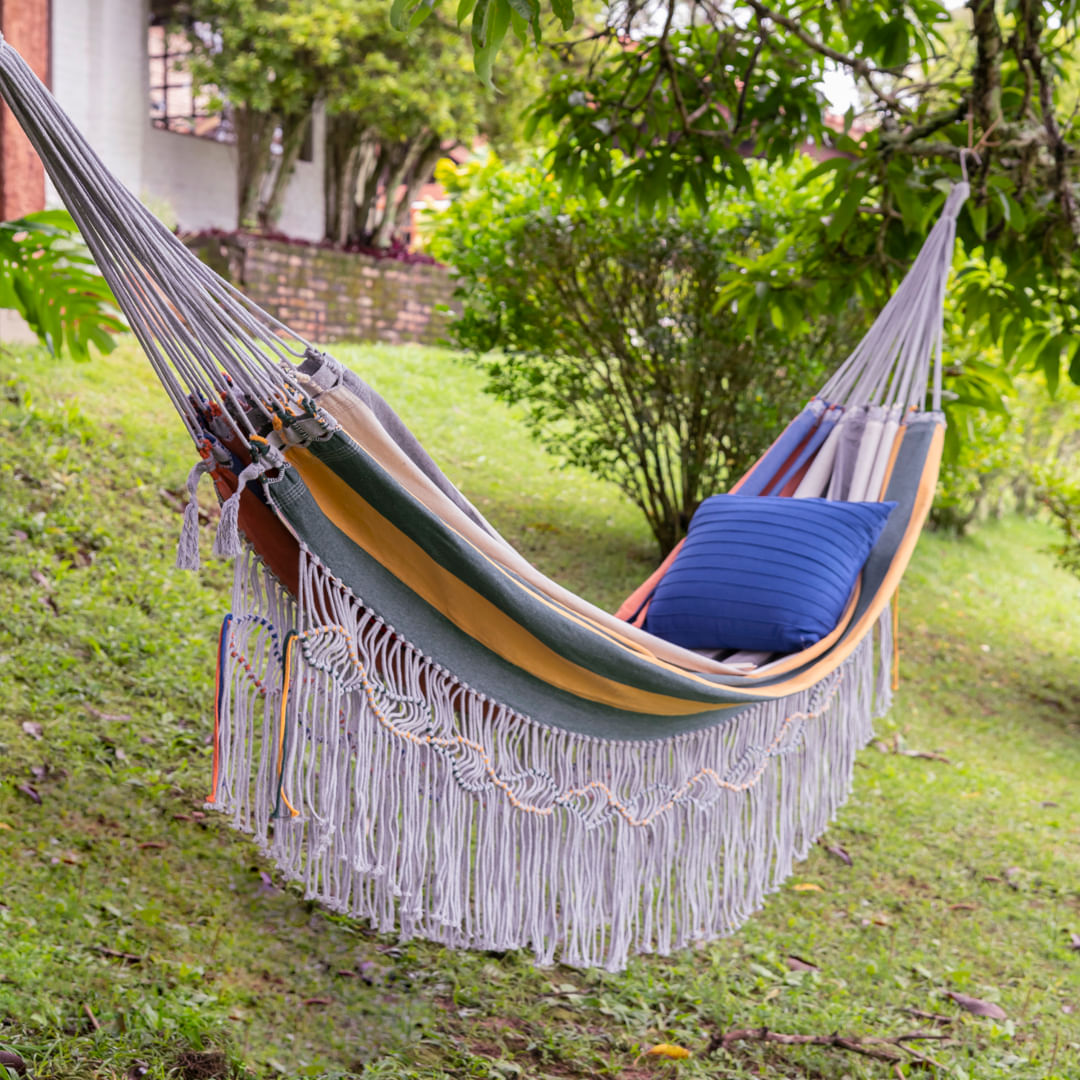 Essa rede de descanso é uma obra de arte, com uma técnica festonè-macramè que a torna exclusiva. Com materiais ecológicos e alta durabilidade, ela oferece uma experiência de descanso confortável e elegante. Inspirada na estrutura do DNA, essa rede combina arte e sustentabilidade. Ela é feita com 80% de algodão e 20% de poliéster, o que a torna muito resistente. Além disso, ela tem uma capacidade de carga de 180 kg, garantindo que você possa relaxar sem se preocupar com a segurança.