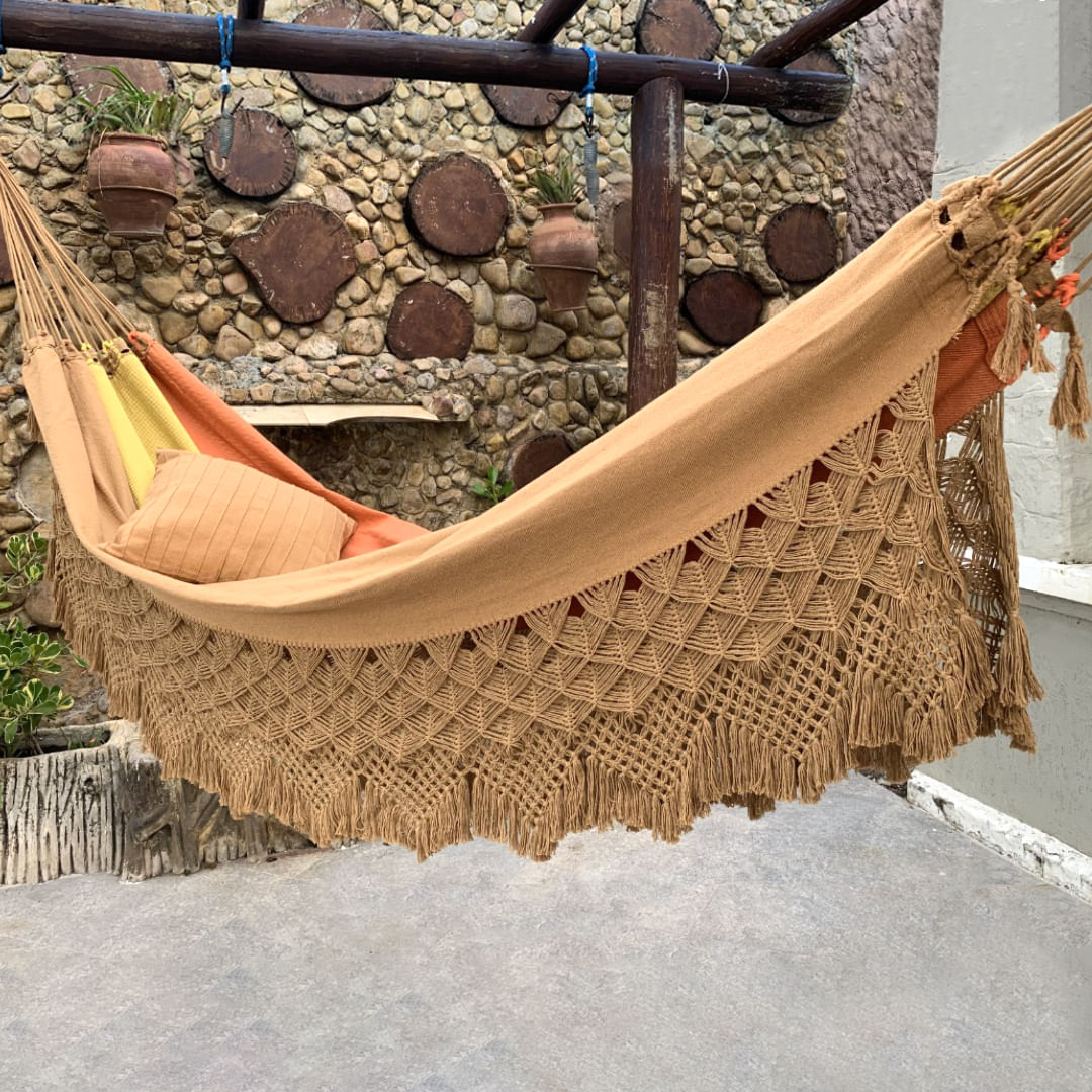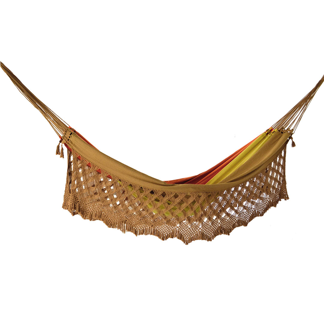 Essa rede é ideal para dar charme ao seu ambiente, com tecido liso e listras largas nas cores vermelho, amarelo e caramelo. Sua varanda é feita à mão com a técnica artesanal macramî. Os punhos, caréus e mamucabas também são feitos à mão e compõem cada detalhe da rede. Com composição de 80% algodão + 20% Poliéster, essa rede oferece confort e durabilidade. A rede completa tem dimensões de 3,80m comprimento x 1,50m largura e capacidade de 180 kg.