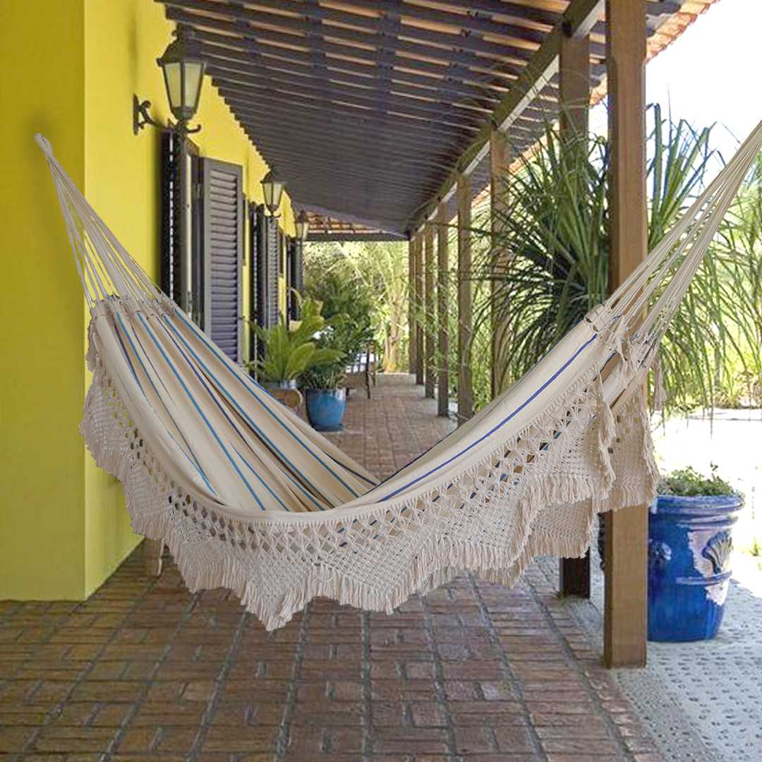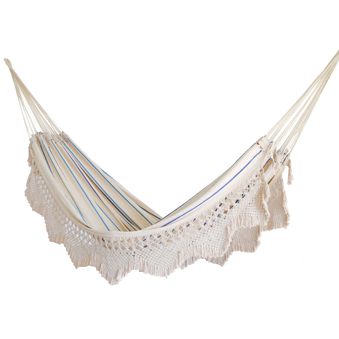 A rede de descanso King TR ML é perfeita para quem busca confort e estilo. Com tons claros e listras em tons de azul, essa rede é feita à mão com tecido reciclado e tipologia artesanal macramê. Com capacidade para 180 kg, é ideal para casais ou pessoas que prezam por espaço. Compre agora e desfrute do melhor descanso!
